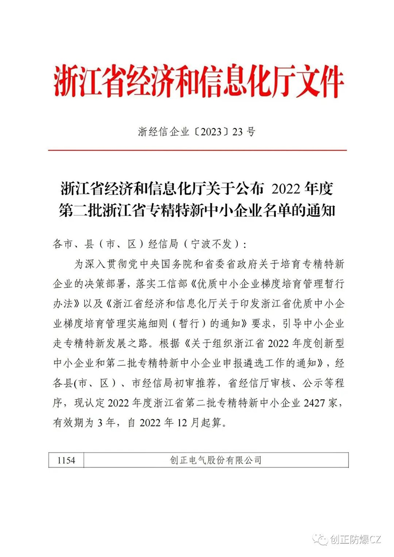 據(jù)浙江省經(jīng)濟(jì)和信息化廳發(fā)布浙經(jīng)信企業(yè)【2023】23號(hào)文件,創(chuàng)正電氣股份有限公司榮獲2022年浙江省專精特新企業(yè)榮譽(yù)稱號(hào)。